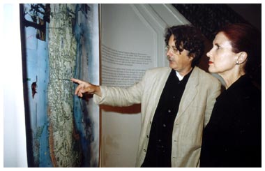 Peter F. Strauss zeigt der Künstlerin Betty Beaumont seine Manhattan-Karte.
