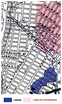 Nördlich der heutigen City Hall befand sich einst ein großer Frischwasserteich. Ein ganzes System von Flüssen, Bächen und Sumpfland trennte die Insel Manhattan in dieser Region von Ost nach West in zwei Teile. Mit zunehmender Industrialisierung wurden die Gewässer zur Abfallbeseitigung benutzt. 1803, infolge einer Gelbfieber-Epidemie, wurde ein Kanal durch das Sumpfland gebaut, um das Sumpfland zu entwässern. Der Kanal liegt genau in der Region, wo heute eine der Hauptverkehrsstraßen, die Canal Street, verläuft. 1813 wurde der Teich zugeschüttet. An seiner Stelle entstand City Hall Park. 1819 wurde der Kanal unter die Erde gelegt, weil er nicht schnell genug floss und die Abwasser darin stanken. Bei starken Regenfällen sind heute einige Keller in diesem Gebiet überflutet, weil das Wasser im überdeckten Flussbett steigt. Mit "Bodenluken" will Alan Sonfist auf den Gehsteigen im Bereich von City Hall Park und entlang der Canal Street (blau markiert) den verschütteten Teich und die überdeckten Wasserwege markieren. Nur ein paar Schritte entfernt liegt das Straßenviertel in Soho (rosa markiert), in dem Sonfist "Bodenluken" mit Manhattans ursprünglicher Vegetation anbringen will. © Alan Sonfist |