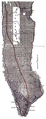 Der Broadway - die geomantische Hauptachse der Insel Manhattan: Der Broadway ist der einzige Straßenzug, der nicht geradlinig von Süden nach Norden führt, sondern organisch durch die Insel Manhattan verläuft. Er folgt auf weiten Strecken einem 'Indian Trail', der von den ersten europäischen Einwandern weiter benutzt wurde. Nach Strauss befinden sich große Teile des Broadway über wasserführenden Kluftzonen mit hoher anregender Qualität im Granit. Der Broadway wäre in diesem Zusammenhang das "energetische Rückgrat" Manhattans. Wahrscheinlich pulsiert hier deswegen das kulturelle Leben. Die Tatsache, dass sich auf dem Broadway die Theater der Stadt konzentrieren, könnte also nicht nur Zufall sein. Im Projekt Manhattan-Energy-Trace soll mit radiästhetischen Mitteln recherchiert und dann die aufgespürten Wasseradern mit geeigneten Mitteln markiert werden. © Peter F. Strauss |