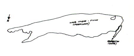Der ursprüngliche Name von Long Island ist "Paumonok" (Fisch). Diese Bezeichnung ist nur dann verständlich, wenn man Long Island aus der Luft betrachtet. Im Osten bildet die Insel zwischen Montauk und East Marion deutlich eine Schwanzflosse. Die Bucht zwischen Long Beach und Rockville ist unschwer als das Auge des großen Fisches zu erkennen. Im schamanischen Bewusstsein der Ureinwohner dieser Gegend sprach die Landschaft in archaischen Bildern zu den Menschen. Sie war erfüllt mit mythischen (Tier)-Gestalten. Tierdarstellungen auf Totempfählen nordamerikanischer Indianerstämme zeigen, dass man bestimmte Tiere als beschützende Kräfte verstand. Am Maul des großen "Fisches" - durch den East River getrennt - befindet sich der "Biber", die Insel Manhattan. © Peter F. Strauss |